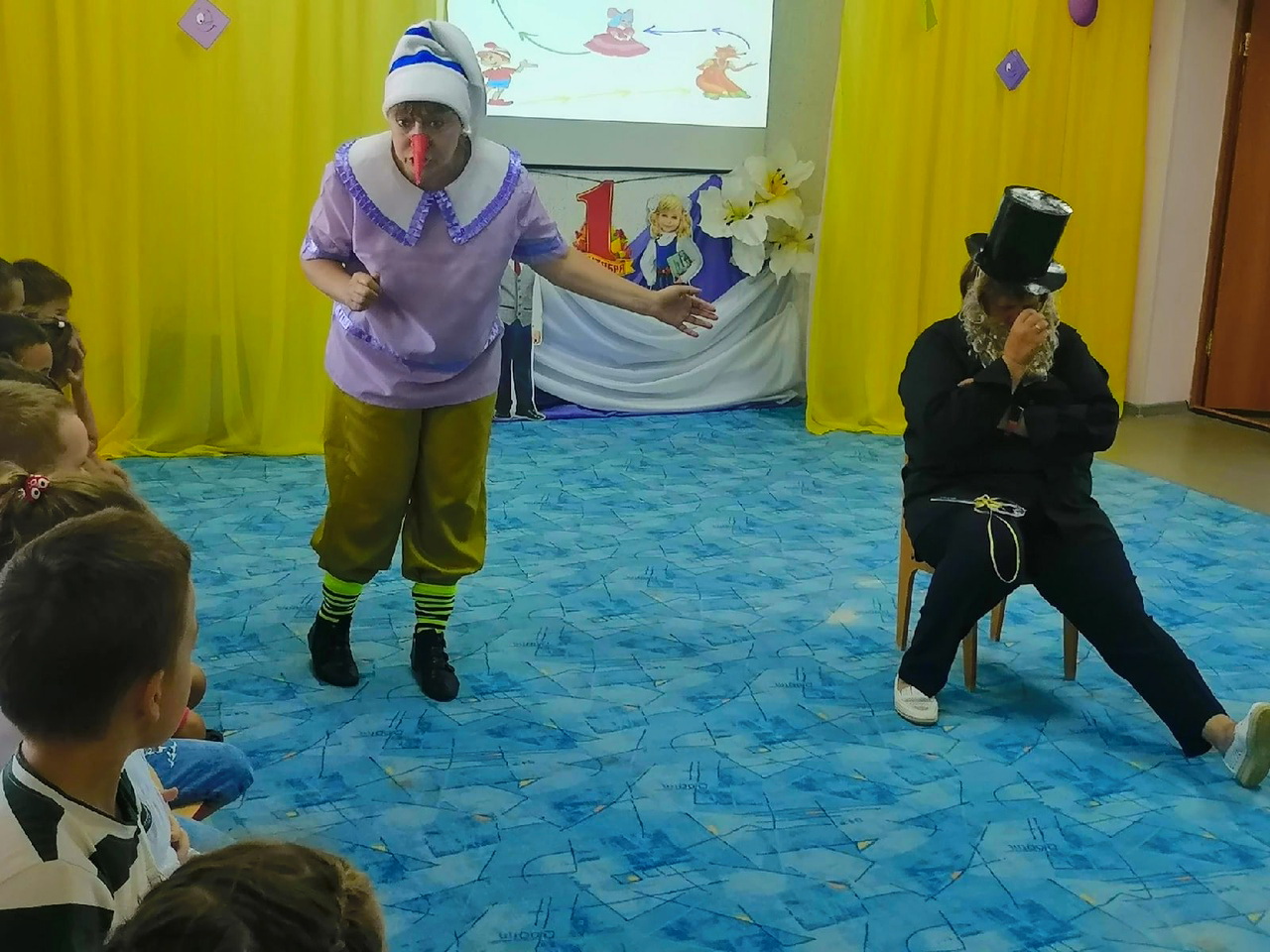 В нашем детском саду первый день нового учебного года прошел ярко и эмоционально. На праздник к детям пришли герои из сказки А. Н. Толстого ,, Золотой ключик, или приключения Буратино''. Не побоявшись трудностей дошколята смело отправились помогать Буратино найти Страну Знаний. Лиса Алиса, хитрила и пыталась обмануть детей , Мальвина загадывала детям трудные загадки, а Карабаса - Барабаса все вместе победили ловкостью. Дети получили огромную радость от праздника, много неожиданных и ярких впечатлений. Мы поздравляем всех – родителей, детей, сотрудников нашего детского сада с этим праздником! Этот день открывает новый учебный год. Пусть он будет увлекательным, интересным и принесет новые знания, открытия и новых друзей!