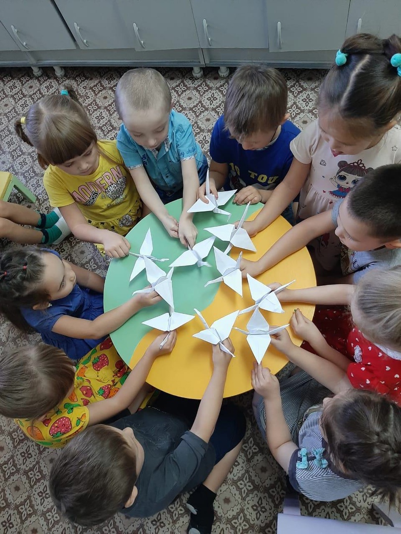 Дети узнали о истории японской девочки , жившей в городе Хиросима Садако Сасаки ставшей жертвой лучевой болезни, изо всех сил старавшейся сделать тысячу бумажных журавлей чтобы выздороветь. По японской легенде, если больной человек сделает тысячу журавликов-оригами, он выздоровеет.