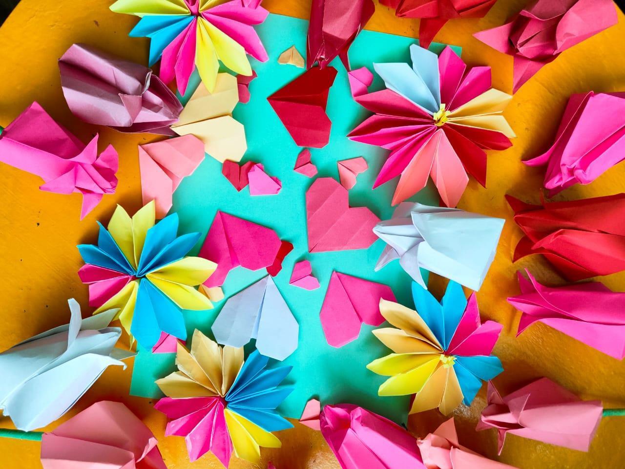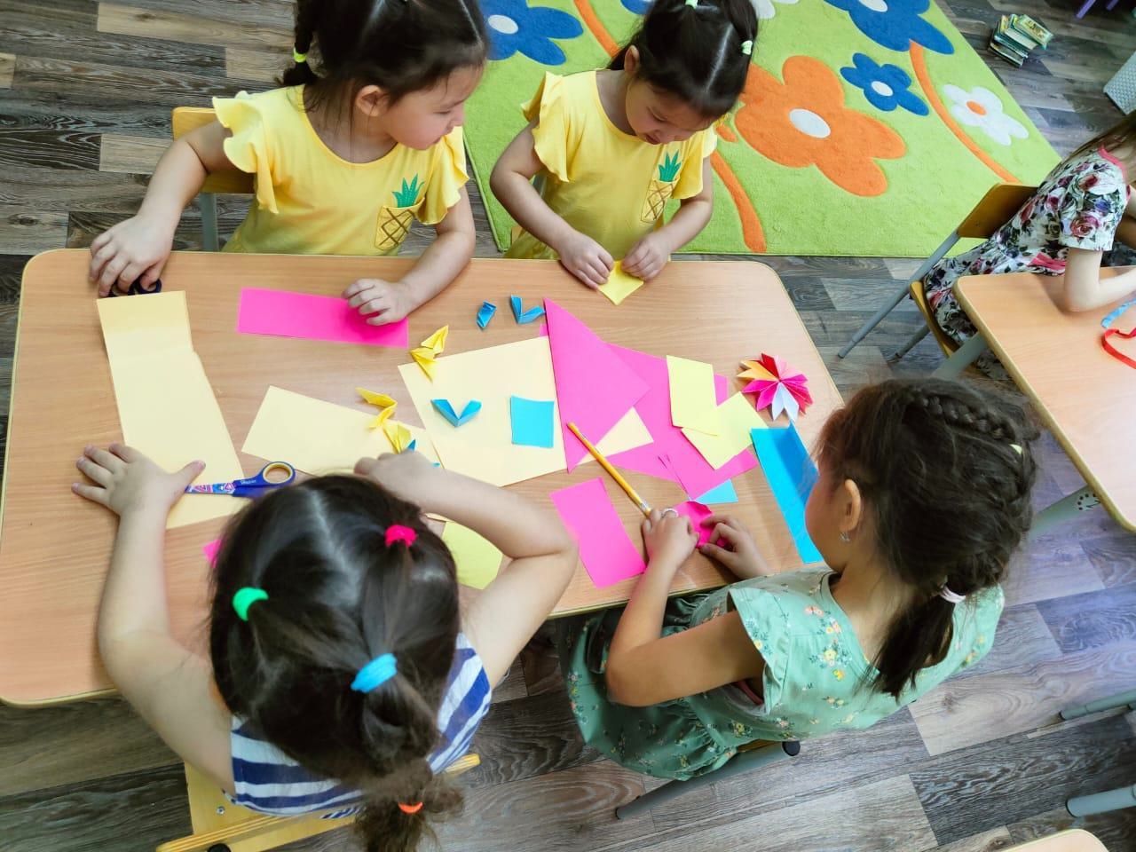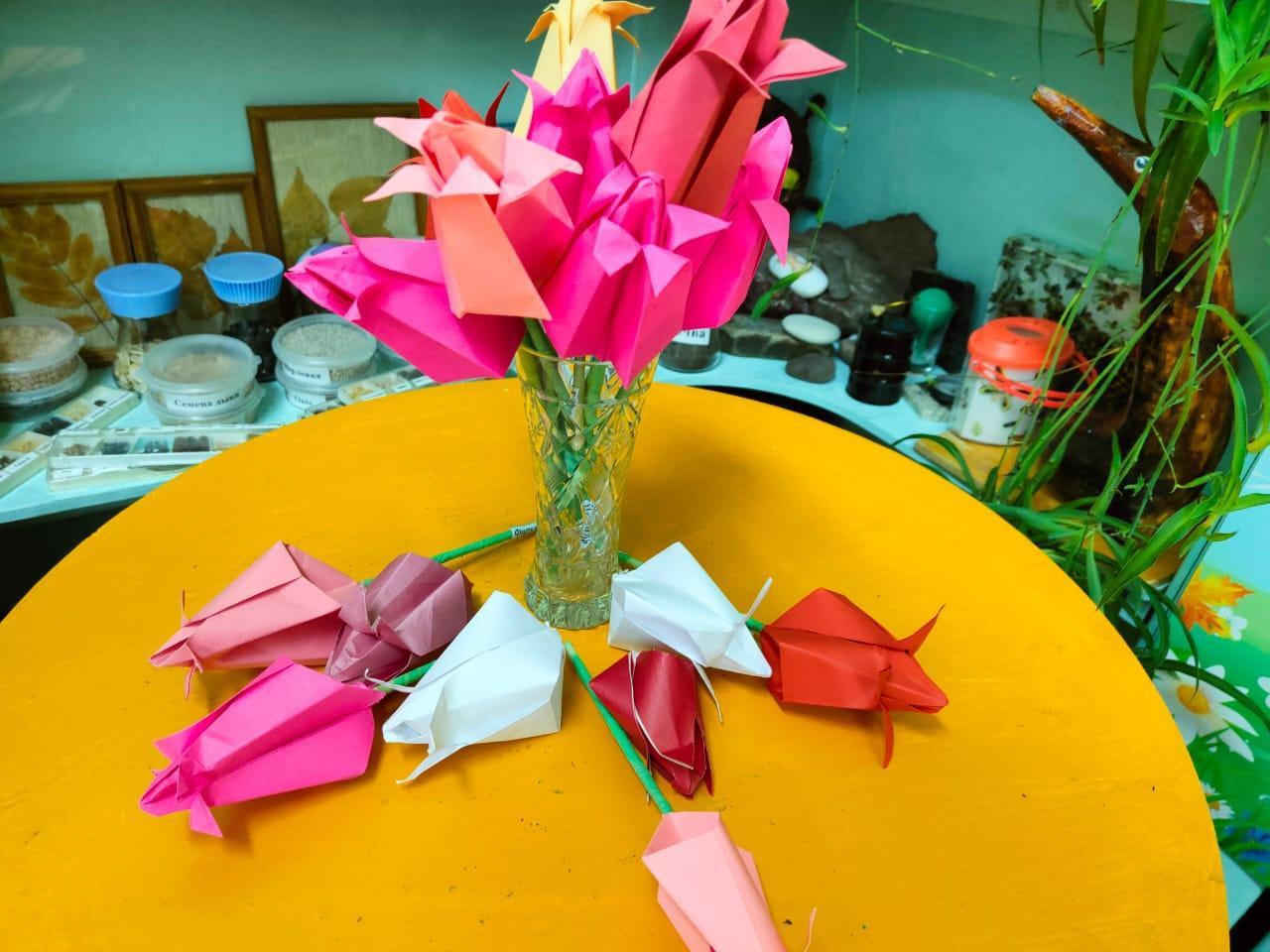 Мальчики и девочки старшей группы «Земляничка» с интересом приступили к изготовлению поделок, работали увлечённо и вдохновенно. В конце стараниями детей расцвели восхитительные цветы. Детям было очень интересно увидеть, как лист бумаги, согнутый ими определённым способом, вдруг превращается в шедевр.